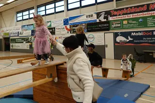 Besonderer Anziehungspunkt war die große Kletterinsel in der Mitte der Halle. Dort wurde gekraxelt, gerutscht und gelacht, was das Zeug hielt. Drum herum zeigten sich die kleinen Spiele ganz groß: Ob „Himmel und Hölle“, Kinderdart, Dosenwerfen, Kegeln, Zielwerfen oder eine spontane Runde Fußball – die bunt verkleideten Närrinnen und Narren hatten sichtlich ihren Spaß. Zwischen Prinzessinnen, Superhelden, wilden Tieren und kleinen Zauberern herrschte beste Stimmung.
